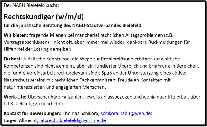 Vergütung: Im NABU Bielefeld arbeiten wir ausschließlich ehrenamtlich – also ohne Bezahlung! Nachgewiesene Kosten werden aber gerne erstattet. Unser Lohn ist ein gutes Gefühl beim Einsatz für den Schutz der Natur!